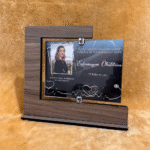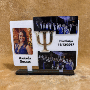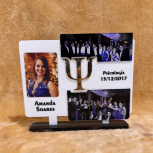 🔹 Placa de acrílico transparente, destacando a foto e os detalhes do curso
